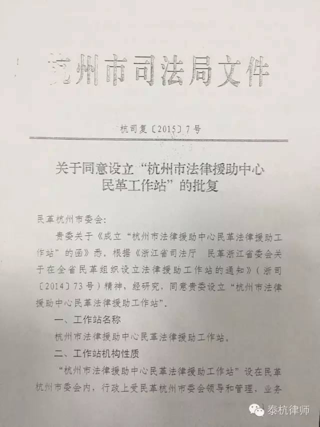 2015年11月12日上午,杭州市法律援助中心民革工作站正式在浙江泰杭律师事务所挂牌成立,民革工作站设站长一名,顾问一名,副站长三名。工作站站长由民革杭州市委会副主委包嘉颖担任;浙江泰杭律师事务所汪政主任、浙江泽鸿律师事务所洪波、浙江五联律师事务所袁施敏担任工作站副站长。