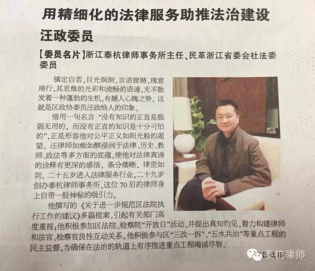 2月23日,汪政主任作为政协委员参加上城区四届五次会议,汪政委员撰写的【关于进一步规范区法院执行工作的建议 】多篇提案,引起了有关部门的高度重视。