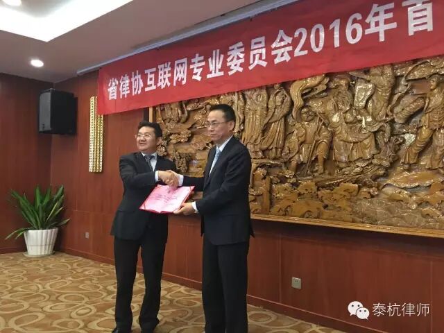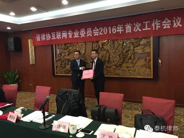 2016年3月27日浙江省律协互联网专委会全体委员会议在杭州顺利召开,省律协副会长唐国华、互联网专委会主任,副主任及专委会委员参加了首次会议。浙江泰杭律师事务所汪政主任受聘担任互联网专委会副主任,具体分管互联网金融法律服务及律所信息化建设工作。会上,省律协唐国华副会长对专委会工作作出重要指示并为专委会主任和副主任颁发聘书。