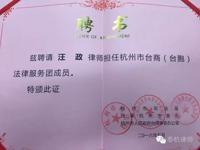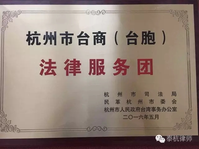 2016年5月27日下午杭州市司法局、民革杭州市委会、杭州市台办、杭州市台协会联合杭州市民中心杭州图书馆一楼举行杭州市台商(台胞)法律服务团成立仪式,聘请杭州市十位律师担任法律服务团成员,服务台商台胞! 浙江泰杭律师事务所汪政主任荣幸成为法律服务团十位律师之一。泰杭律师将本着专业性、独立性为杭州台商提供法律服务!