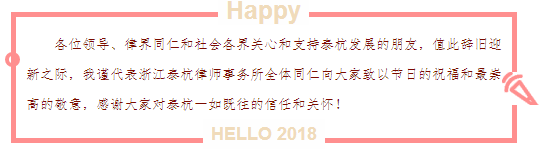 2018已然来临,今年势将成为泰杭转型升级的元年。泰杭没有理由骄傲,没有理由固步自封,更没有理由懈怠,泰杭只有持之以恒的负重前行,不断探索从中低端律所向中高端律所创新发展的转型升级之路!泰杭合伙人团队将深刻把握新常态下律所发展规律,以新理念引领新常态,以新思想指导新实践,推动泰杭持续稳定健康发展。2018年泰杭也将通过律所管理和律师服务信息化、标准化的建设,进一步完善质量管理体系,为社会各界提供更优质高效的法律服务,为社会经济发展贡献泰杭力量!