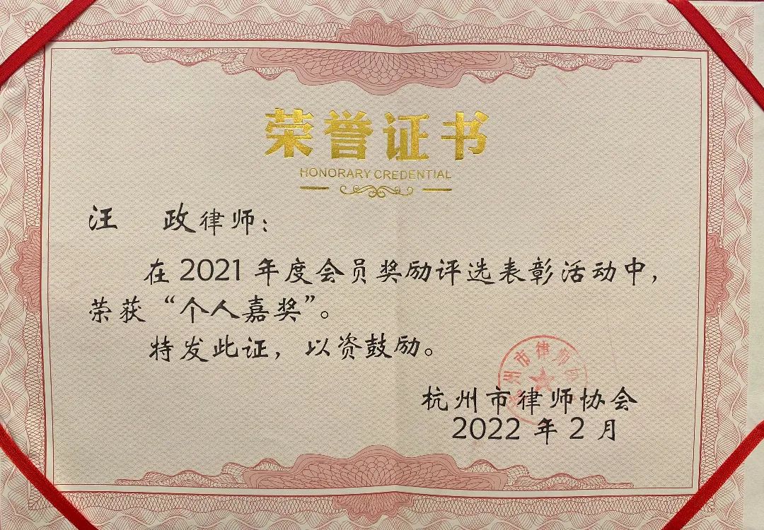 大会上,因积极参与社会公益事业、履行律师社会责任,浙江泰杭律师事务所汪政律师荣获2021年度杭州市律师协会“个人嘉奖”荣誉;浙江泰杭律师事务所周燕律师、郑利芬律师荣获2021年度杭州市律师协会通报表扬。