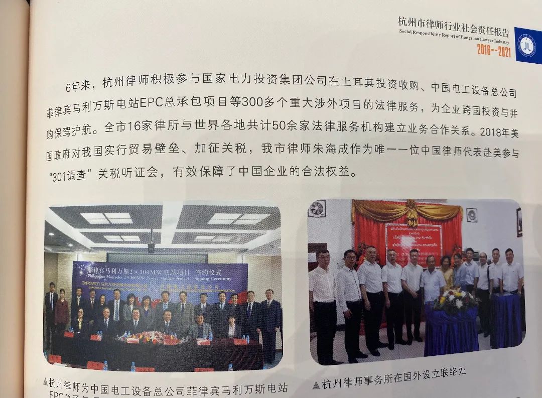 大会表示,杭州律师今年持续参与重大涉外法律服务项目。浙江泰杭律师事务所积极开拓涉外法律服务项目,2017年率先设立老挝人民民主共和国CLX老中律师事务所浙江联络处。泰杭律师积极服务企业跨国投资和并购保驾护航被列入《杭州市律师行业社会责任报告(2016-2021)》。